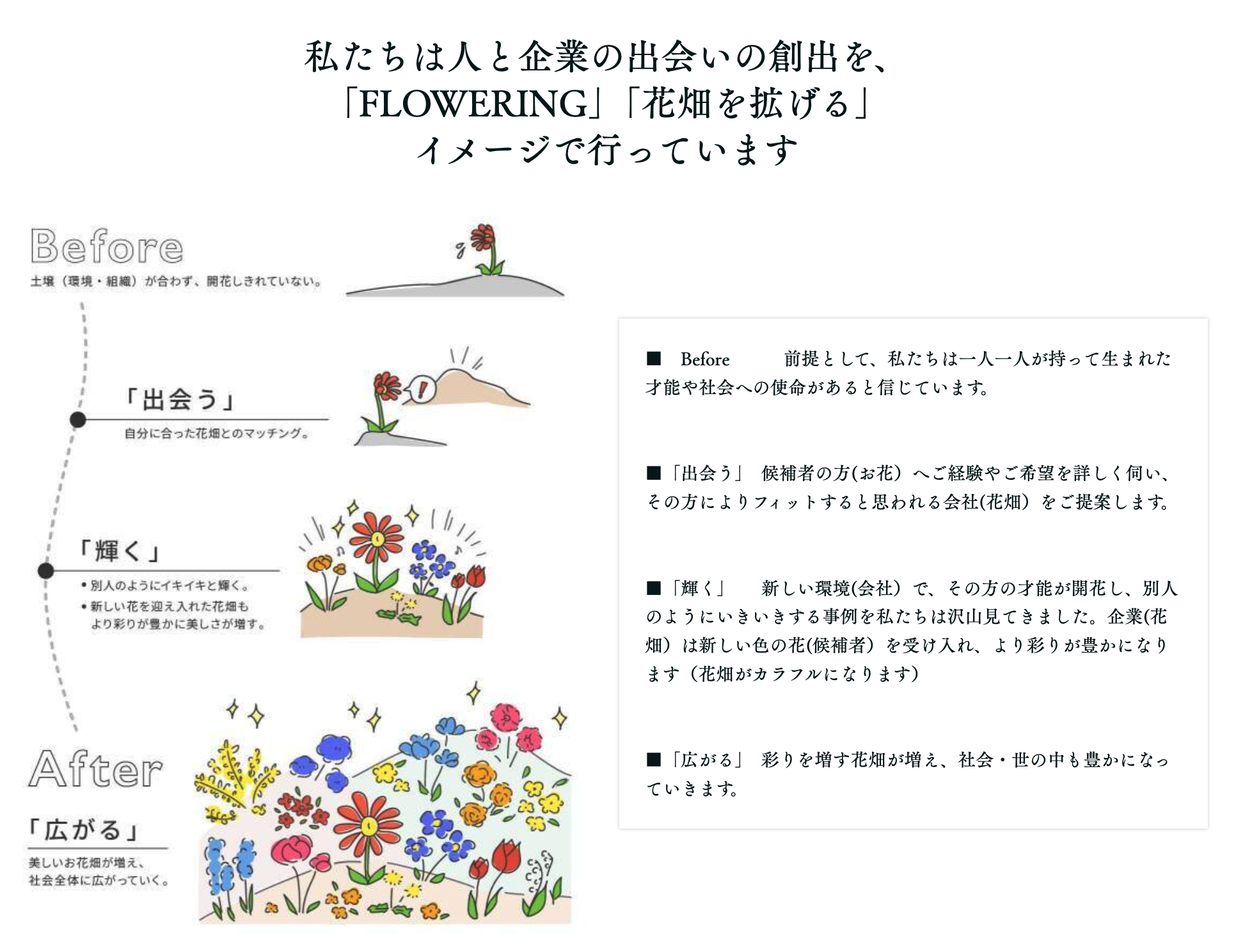 想いのある企業と人材が「適切に」出会う事で化学反応が起こり、意義のある事業が進展し、社会が変化していく。