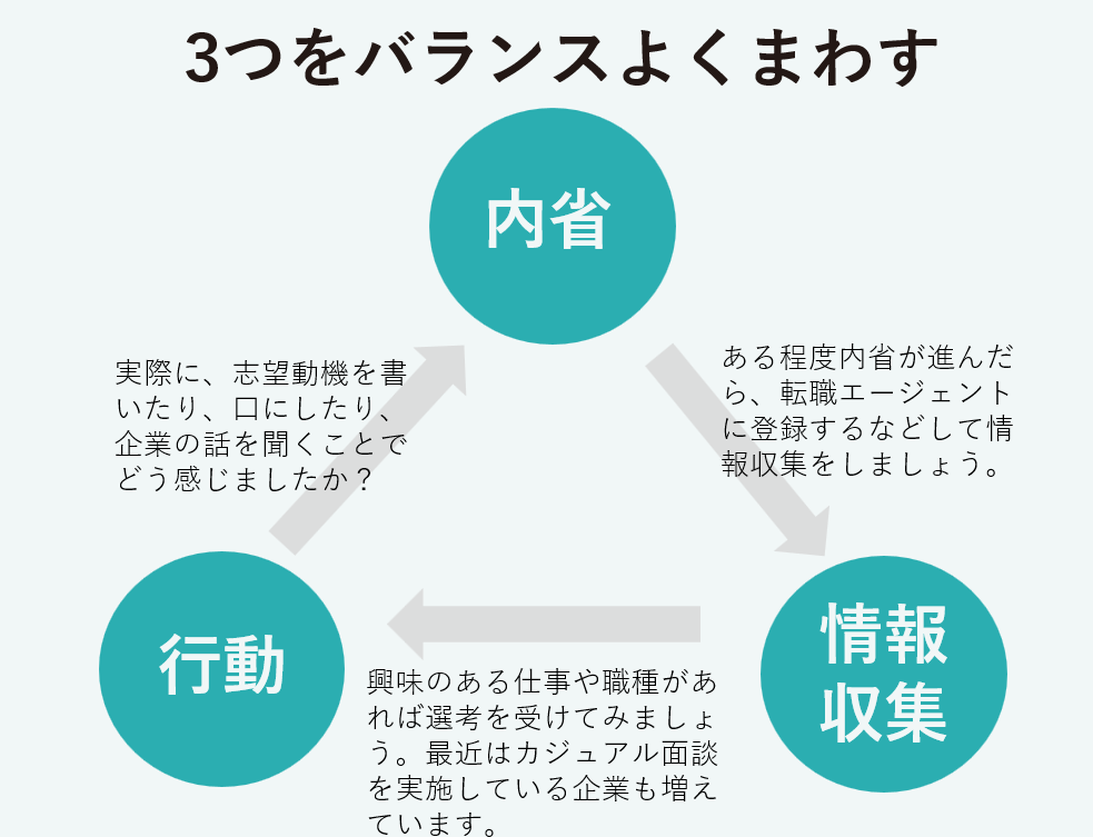 自分に合った社会貢献性の高い企業を見つけるためには、「内省」「情報収集」「行動」の3つをバランスよく進めることが重要です。