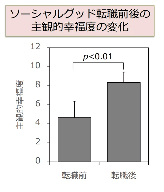 当社からご転職された方20名を対象に転職前後の主観的幸福度を測定した結果、平均幸福度が4.65→8.35と変化したことが確認出来ました。